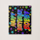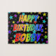 This vibrant, lively, birthday-themed jigsaw puzzle design features the message "HAPPY BIRTHDAY, BOBBY" with the characters having a colourful rainbow spectrum inspired gradient pattern, along with an exciting stars background pattern. A colourful puzzle like this might be used to send birthday wishes to somebody named Bobby. [~Z0000468]