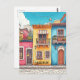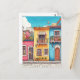 A delightful and vibrant illustrated postcard showcasing the charming streets of Bodrum, Turkey. The scene features beautifully textured Mediterranean houses painted in bright hues of yellow, blue, and red, adorned with rustic wooden balconies, decorative windows, and cosy awnings. The cobbled stone pathway and fairy lights overhead add to the picturesque atmosphere, while fluttering butterflies and lush greenery complete the warm and inviting ambiance.