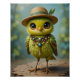 An acrylic painting of an adorable, fluffy baby bird in chartreuse green, standing upright with charming personality. The bird features large, expressive glossy brown eyes with prominent light reflections, a small pointed yellow-orange beak, and delicate wispy feathers on its head and body. It wears a meticulously painted woven straw boater hat with a patterned green band and a tiny feather or leaf accent. Around its neck, a vibrant bohemian-style statement necklace is adorned with painted beads, gems, charms, tassels, and metallic-like elements, adding colorful detail. The bird's small, folded brown wings and slender legs are carefully rendered, standing on textured brown ground. The background is a soft, painterly bokeh of light blues and greens, evoking a natural, out-of-focus environment. The style showcases visible brushstrokes, rich acrylic textures, vibrant colors, and well-placed lighting that highlights the intricate details and lively character of the scene.