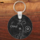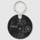 A bohemian style black and white keychain with a white floral chalk drawing of a dandelion puff and other wild flowers amidst filigree swirls against a black chalkboard slate style background. Personalise this pretty blackboard design by adding your name.