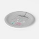 Baby shower paper plates featuring an illustration of a bohemian inspired crib mobile with snow capped mountains, stars, moon, tipi, feather, and arrow.