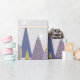Marine blue and golden design featuring boho pine trees and white snowflakes.