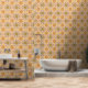 Bold Boho geometric green pattern peel and stick wallpaper. Create a warm earthy accent wall with this unique pattern, or embellish the inside back of a shelf or the front of a credenza. Think out of the box for some DIY fun creating your home decor style. Pink mustard green.