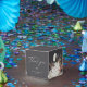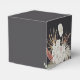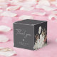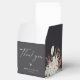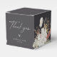 Beautiful rustic bohemian white orchid and dried botanical palm leaf arrangements, wedding favour box. Black onyx colour background, coordinating white text with graphic "Thank you" and doodle heart accent. Designed to match our Bohemian Oasis Wedding Collection.