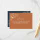 Elegant, bohemian, modern navy blue and terracotta wedding details card with faux gold floral lace and simple script.