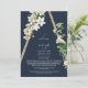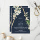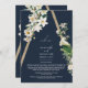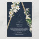 A beautiful bohemian style rustic wood pyramid with white watercolor florals cascading on the side and a blue background. A unique design that uses vintage white watercolor botanicals on a bohemian triangle structure. A charming white floral design with rustic and geometric features and elegant script typography. An elegant wedding itinerary card design with modern elements. Matching wedding invitations and other stationery items are also available.
