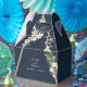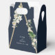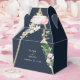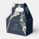 A beautiful bohemian style rustic wood pyramid with white watercolor florals cascading on the side and a blue background. A unique design that uses vintage white watercolor botanicals on a bohemian triangle structure. A charming white floral design with rustic and geometric features and elegant script typography. An elegant wedding favour box design with modern elements. Matching wedding invitations and other stationery items are also available.
