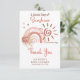 Boho elements sunshine, rainbow, moon and stars with pink flower and dried grasses bouquet "A Little Ray of Sunshine Is On Her Way" girl baby shower "Thank You" design. Features shades of rosy pink and medium and dark terracotta on white. Composite design by Holiday Hearts Designs.