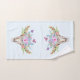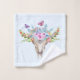 Bath towel set with a turquoise and pastel watercolor background. A boho chic animal skull with a floral bouquet upon its head and little butterflies fluttering about.