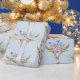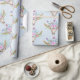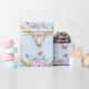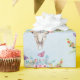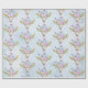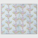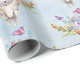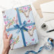 Wrapping paper with a pastel blue grungy style background. Layered over top is a boho chic animal skull with a floral bouquet upon its head and little butterflies fluttering about.