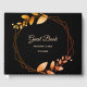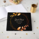 Set against a striking black background, this guest book features apricot-coloured text that provides a warm and inviting touch. Delicate leaves in soft muted earth tones and earthy autumnal copper shades evoke the cosy charm of autumn, while the geometric frame in burnt orange and terracotta adds a rustic yet sophisticated flair. This guest book perfectly complements your autumn-themed wedding, capturing the essence of a bohemian chic celebration. This guest book radiates warmth and elegance, reflecting the romantic and modern minimalism of your special day.