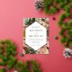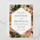 Elegant autumn wedding invitations featuring your wedding details nestled in a gold foil geometric frame surrounded by watercolor flowers and greenery in muted autumnal colours of ivory, orange, mustard gold, olive green, dusty rose, and brown. The fall floral wedding invitations reverse to display a rich olive green watercolor background. Designed to coordinate with our Boho Autumn Floral wedding collection.