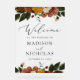 Rustic wedding welcome sign featuring watercolor flowers and greenery in muted autumnal colours of ivory, orange, mustard gold, olive green, dusty rose, and brown with a faux frosted acrylic background. "Welcome" is displayed in a modern calligraphy script with your names and wedding date shown below. Designed to coordinate with our Boho Autumn Floral wedding collection.