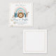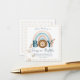 These cute custom diaper raffle enclosure cards for a baby shower feature a watercolor style bohemian safari illustration. The word boy features a little lion head in the centre. A blue and beige boho rainbow is pictured in the back. Cute lion cub pawprints are printed along the left.