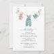 Oh so sweet baby clothes hang on a clothesline in this boho baby shower invitation. Features knit overalls, shoes and cute little bear. This charming invite has script typography with the words oh baby in muted blue as well as script for the mama's name. See coordinating items in our shop.