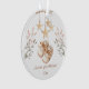 In boho style, a round ceramic Christmas ornament featuring a delicate watercolor-style illustrations. At the top, golden stars dangle from strings, adding a festive touch. Centred are a pair of adorable baby shoes tied with satin bows, symbolising a newborn’s first holiday season. Subtle branches with muted green leaves and soft brown accents frame the sides. Below, the customisable text reads “NAME first Christmas” with the year 20xx beneath. this ornament is a charming keepsake for new parents.