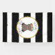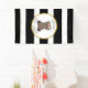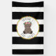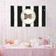 A baby shower banner featuring an illustration of a baby bear wearing a flower crown over a black and white stripe background. Personalise the text.