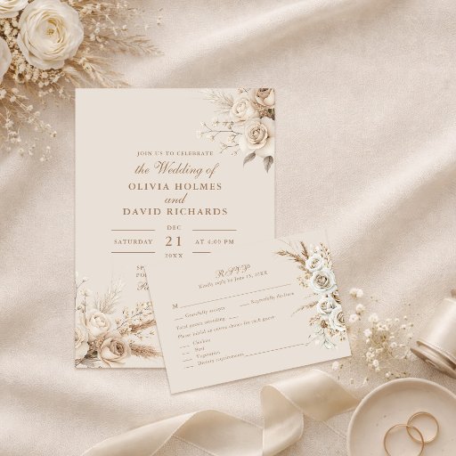 Complete your wedding stationery suite with this elegant boho envelope featuring a matching floral liner. The exterior is a soft beige tone that can be personalised with your names and return address, while the inside reveals a beautiful arrangement of dried flowers and white roses. This envelope is the perfect finishing touch for sending your invitations, Save the Dates, or RSVP cards in style. Its romantic and rustic design coordinates perfectly with the rest of the Boho Beige Dried Flowers and White Roses Wedding Collection. Fully editable and easy to customise for any wedding theme with a natural or neutral colour palette.