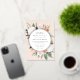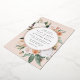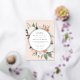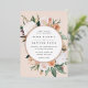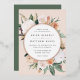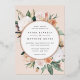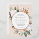 Elegant floral wedding invitation features your wedding details in modern lettering, set in a round frame of pastel watercolor flowers and botanical foliage in desert inspired earth tone shades of peach, sage green, white and ivory. Rose gold foil trim completes the look for a luxe touch.
