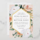 Elegant floral wedding invitation features your wedding details in modern lettering, set in a geometric elongated hexagon shaped frame of pastel watercolor flowers and botanical foliage in desert inspired earth tone shades of peach, sage green, white and ivory. Gold foil trim completes the look for a luxe touch.