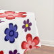 This tablecloth features a beautiful colorful floral pattern of blue, purple and red stylized daisies against a white background; perfect for adding a touch of retro cuteness to your dining room or kitchen.