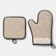 This customisable oven mitt and pot holder set will add a boho accent to your kitchen. It features a pattern of white and ivory foliage on a light brown background. Personalise by adding a name. This botanical oven mitt and pot holder set will be perfect as a housewarming gift.