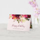 This elegant happy birthday card features pretty watercolor flowers and feathers in vibrant shades of marsala, burgundy, wine, deep green, red, and purple, on a soft blush pink background. Matching script typography on the front and back add an additional trendy and stylish touch that anyone will love.