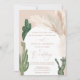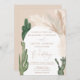 Tropical Boho desert green cactus and pampas grass wedding invite with wild cacti, pampas watercolor,arch shaped with muted earth tones with light beige and terracotta colours with beige sandy arch.