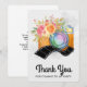 Party thank you card with a watercolor illustration of an orange camera with a floral bouquet and a black and white wavy film strip. The backside has a message you can personalise.