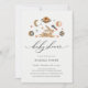 Bohemian chic illustrated bunny, moons, stars and planet, celestial theme baby shower invitation. Elegant typography design style template with coordinating rustic sage green colour backgrounds.