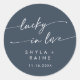 This boho chic dark navy blue lucky in love favour classic round sticker is perfect for a minimalist wedding. The muted and moody neutral dark blue modern bohemian design features simple rustic calligraphy with a unique yet classic style.