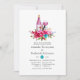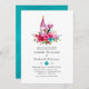 Boho chic pink and turquoise blue watercolor floral wine tasting rehearsal dinner invitation.