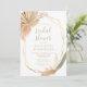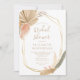 This trendy boho bridal shower invitation features a gold geometric frame decorated with watercolor dried tropical palm leaves and pampas grass in shades of beige, peach and muted green. Customise the beige text with your bridal shower details. The reverse side is a coordinating shade of solid peach-tinted beige.