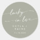This boho chic sage green lucky in love favour classic round sticker is perfect for a minimalist wedding. The neutral light green earth tone modern bohemian design features simple rustic calligraphy with a unique yet classic style.