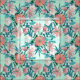 This girly spring Garden flowers and foliage watercolor paint, elegant botanical pattern, roses, wild spring flowers, Japanese green bamboo foliage and fruit plant branch with white flowers leaves, blooming nature pattern, blush, pink, coral, yellow and green colours, over a aqua green and carnival glass green blend background, modern, trendy art, great for everyday wear or home decor. A stylish, trendy, romantic design, simple artwork image.