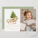 Simple, yet elegant photo holiday card featuring a boho watercolor sleigh filled with a Christmas tree and gifts. "Merry Christmas" is displayed below in a beautiful gold foil script. Personalise the front of the card by adding your name, the year, and a photo. The card reverses to display your custom message with a sage green background.