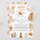 This boho gender-neutral baby shower by mail invitation features baby clothes such as a mobile with a bear, romper, pants, stuffed bear/animal, jacket, boots, diaper, bib, bottle and pyramid toy. The reverse side features a light beige/tan background with baby toy patterns. Personalise it for your needs. You can find matching products at my store.