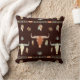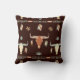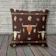 On this pillow is an attractive tribal motif that features cow skulls and feathers. The images are in tones of brown, pale blue, tan and gold, and placed on a dark brown black background. Both sides of the pillow have the same design, which fits well into a western or native american decor scheme.