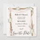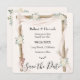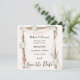 A unique Save the Date wedding announcement flat card. A watercolor boho rustic wedding arch adorned with draping elegant silk chiffon, ivory rose flowers, and foliage of greenery, palm and pampas with feathers and a vine covered arrow. The back of the card has a delicate floral bouquet in both corners. The cream colour background can be changed by clicking the 'edit design' button. Click the 'personalise' button to add all of your details.