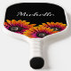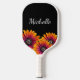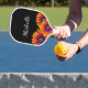 Boho Rustic personalised Pickleball paddle, with a colourful daisies design on a black background. With customisable script lettering, you can add your own name. Great for adding a stylish touch to your favourite game.