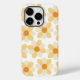 Hand drawn, boho daisies in orange and yellow with a white background.