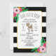 A baby shower invitation featuring an illustration of a baby deer wearing a pink flower crown. Personalise the text. Background is black and white striped pattern.
