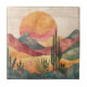 This vibrant bohemian desert ceramic tile showcases a glowing sun over layered mountains with stylised cacti, succulents, and desert flora. Rendered in warm earthy tones of orange, red, yellow, and green with a textured, hand-painted feel, it blends modern boho style with Southwestern charm. This nature-inspired artwork makes a thoughtful gift for birthdays, holidays, housewarmings, weddings, or simply for those who love desert landscapes and bohemian aesthetics.