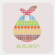 A baby shower sticker featuring an illustration of a boho dots print bundle. Green text says "BABY!" Look for matching baby shower invitations and more at Jill's Paperie.