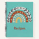 Modern and artistic design features hand drawn Boho rainbow doodle in earth tones on aqua background. Customisable "Recipes" text in modern terra cotta coloured font