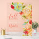 This boho-inspired fall bridal shower welcome sign beautifully combines hand-painted watercolor florals with warm, autumnal hues. The vibrant design features a bouquet of sun-kissed roses, dahlias, and peonies in shades of orange, red, and soft green, evoking the essence of the season. The bold "Fall in Love" script elegantly introduces the celebration, while the layout provides a welcoming message for guests. This sign not only sets the tone for a cosy, rustic event but also adds a personal and artistic touch to the entrance of your bridal shower.