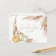 Embrace the bohemian spirit of fall with our Boho Fall Pampas Grass Save the Date Postcard. This captivating design captures the essence of the season with its warm and earthy tones, complemented by a beautiful arrangement of pampas grass. The postcard format adds a touch of simplicity and convenience, making it easy to send out to your loved ones. Announce your wedding date in style and invite your guests to join you on this enchanting journey. With its boho-inspired charm and autumnal vibes, this save-the-date postcard sets the stage for a memorable and intimate celebration