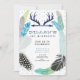 Boho tribal Birthday invite adorned with blue, grey and neutral feathers, arrows, deer antlers. Have a pow wow birthday party with this Bohemian tribal invite