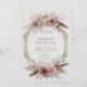 Invite your guests to a celebration of bohemian romance and natural elegance with this exquisite wedding invitation. The design features a stunning central oval frame, intricately bordered by delicate gold scrollwork and subtle metallic accents. This frame is gorgeously encircled by a lavish wreath composed of soft, layered blush pink and deep mauve daisy-like flowers, interspersed with delicate beige and gray feathers and muted blue-gray foliage. The entire composition sits against a creamy white, textured background, beautifully blending earthy, organic elements with opulent accents, perfectly setting the stage for a unique, stylish, or desert-themed wedding. This invitation card is ideally suited for a bohemian style wedding, a chic engagement celebration, or an outdoor fall reception. It would also perfectly suit a sophisticated desert-themed party or a serene, elegant vow renewal ceremony. The card's captivating blend of pristine florals and a moody, monochromatic backdrop ensures it is versatile for any solemn ceremony, corporate gala, or refined birthday announcement.