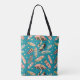 This unique and attractive tote bag features a pattern of boho style feather images in colours of teal blue, gold, dark grey, dusty pink and cream. The pattern is printed on both sides of the bag on a medium dark teal background. Be sure to see the matching products in our store.